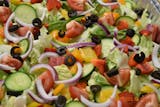 Tomatoes, cucumbers, onions, green peppers, black olives.